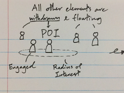 • [Engaged] - An element is said to be “engaged with a POI '' when it is inside a POI’s radius of interest. This state of being can be interpreted as if the element exists simultaneously everywhere in the POI but nowhere else. The element becomes explicitly acknowledged as if it is in the spotlight.